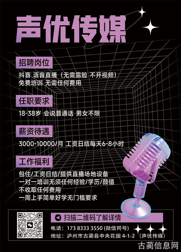 工作地址: 古蔺县天立·中央花园正大门步梯二层声优传媒